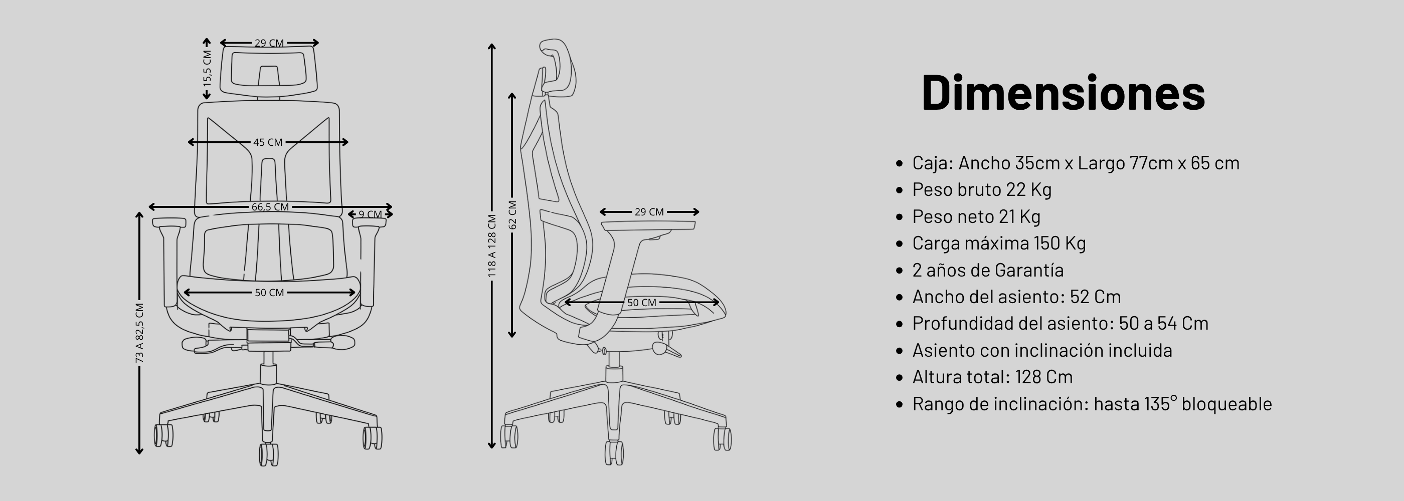 - Respaldo con Mecanismo de 3 posiciones fijo adelante, fijo intermedio y fijo atrás, o se puede dejar suelto para moverlo con tu propio peso. 90°, 115° y 135°