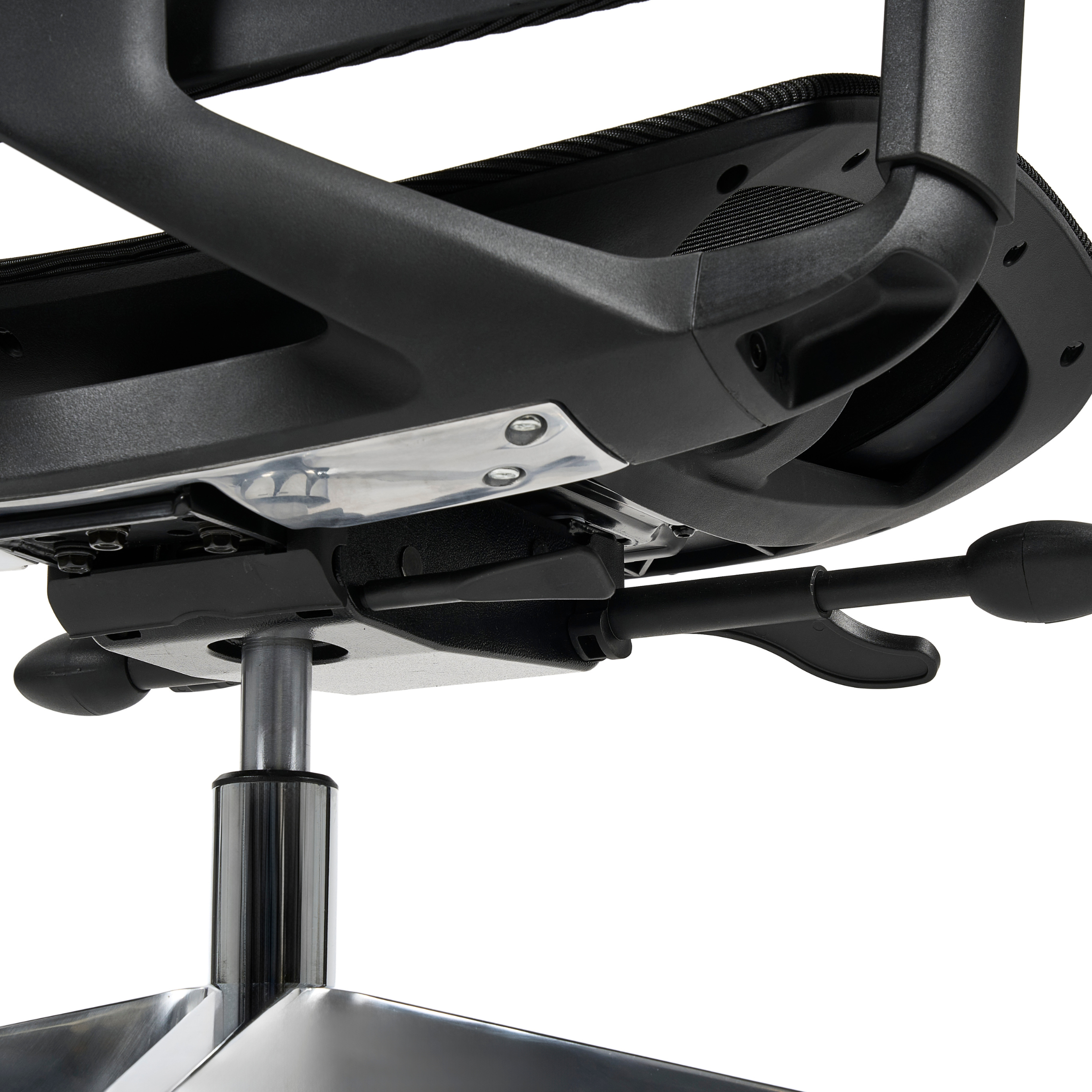 Base del respaldo de aluminio y equipada con un mecanismo sincrónico que permite el movimiento coordinado entre respaldo y asiento. Esta tecnología asegura la inclinación del respaldo, la profundidad del asiento y el grado de tensión del respaldo.