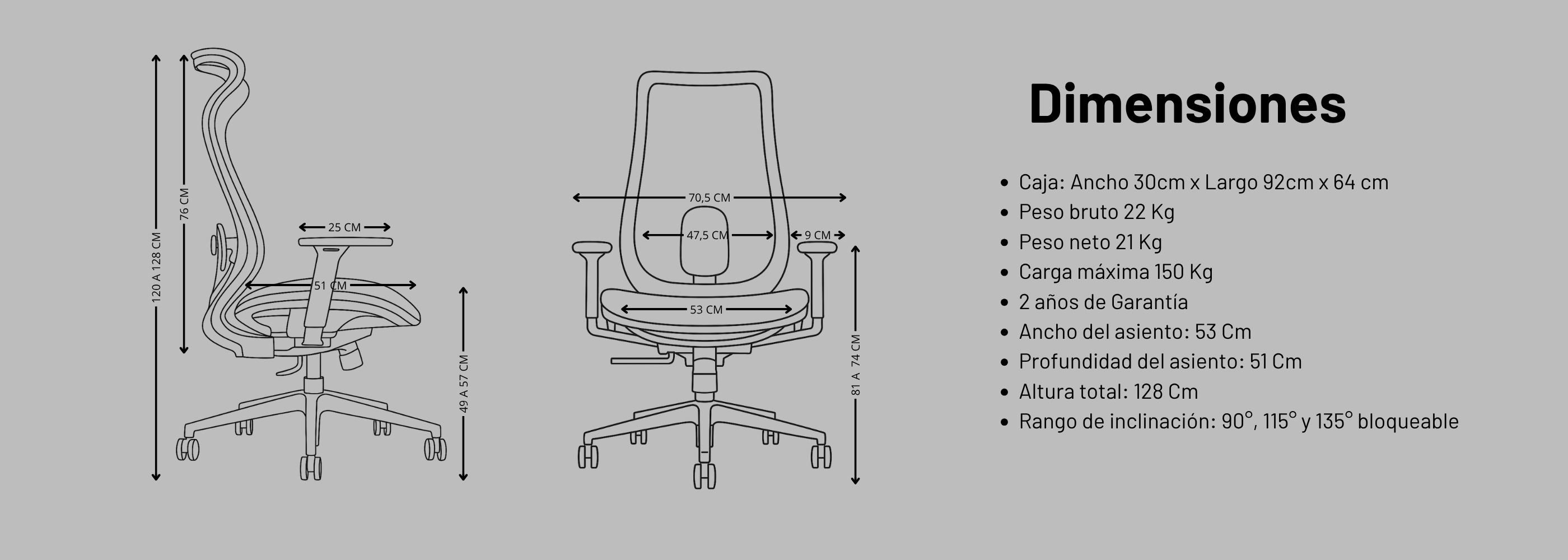 - Respaldo con Mecanismo de 3 posiciones fijo adelante, fijo intermedio y fijo atrás, o se puede dejar suelto para moverlo con tu propio peso. 90°, 115° y 135° bloqueable.